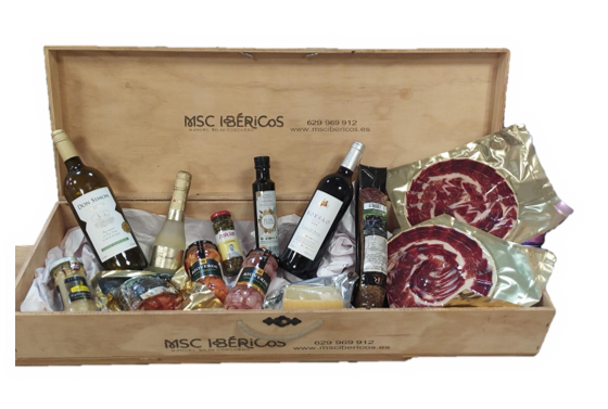 Magnífico lote formado por dos sobres de jamón ibérico, cuña de queso de oveja (350 gr.), Morcón ibérico (350 gr.), Espárragos blancos (185 gr.), Vinagre Condado de Huelva, Cebollitas rojas Rioverde (345 gr.), Zanahorias baby Rioverde (345 gr.), Alcaparras gourmet (100 gr.), Botella de vino blanco, Botella de vino tinto, botella de Freixenet