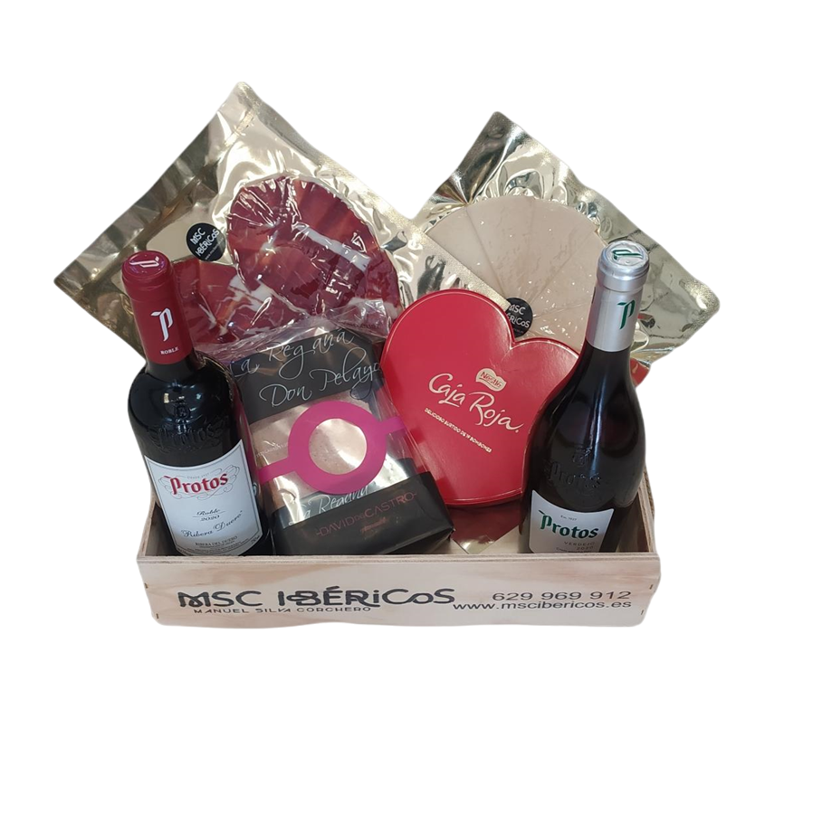 Corazón de jamón ibérico, plato de queso viejo, regaña gourmet Don Pelayo, Bombones Caja Roja Nestlé, Botella de vino Tinto Protos, Botella de vino Blanco Protos.