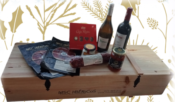 2 sobres de paleta bellota LAZO 80gr, 1pz. salchichón MSC Deliscatessen 450gr aprox. 1 tarro de crema de queso de cabra PAYOYO 170gr, 1 caja de bombones nestle caja roja 100gr, 1 tarro de tomate frito Los Palacios 365gr, 1 botella de vino tinto Protos Roble y 1 botella de vino blanco Protos Verdejo