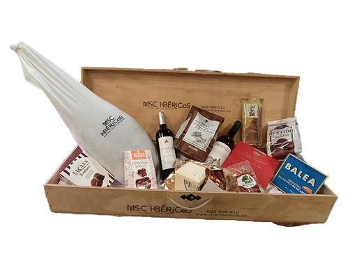 Paleta Selección MSC, cuña de queso de oveja (250 gr.), Morcón ibérico Ovipor, Lata Mejillón gigante, Caja Roja Nestlé, Bombones La Casa, Turrón, Cortadillos y surtido de chocolate, botella vino blanco, botella vino tinto.