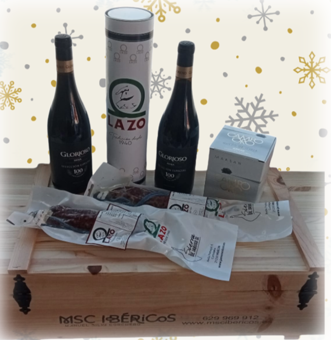 1 Lomito de presa LAZO 400gr aprox. 1/4 de queso oveja añejo campo oro, 2 salchichón presa LAZO y dos botellas de vino tinto rioja D.O. Glorioso Selección