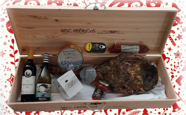 Paleta MSC DELICATESSEN 5/6kg, 1/4 queso oveja añejo Campo Oro, 1pz. lomo MSC Delicatesen 450gr aprox. 1 botella de vino tinto Emilio Moro Finca Resalso, 1 botella de vino blanco Albariño Marieta, 1 tarro de tomate frito Los Palacios 365gr, 1 lata de pedacitos de caballa Lola 1kg y 1 lata de filetes de anchoa del cantábrico en aceite de oliva 50gr.